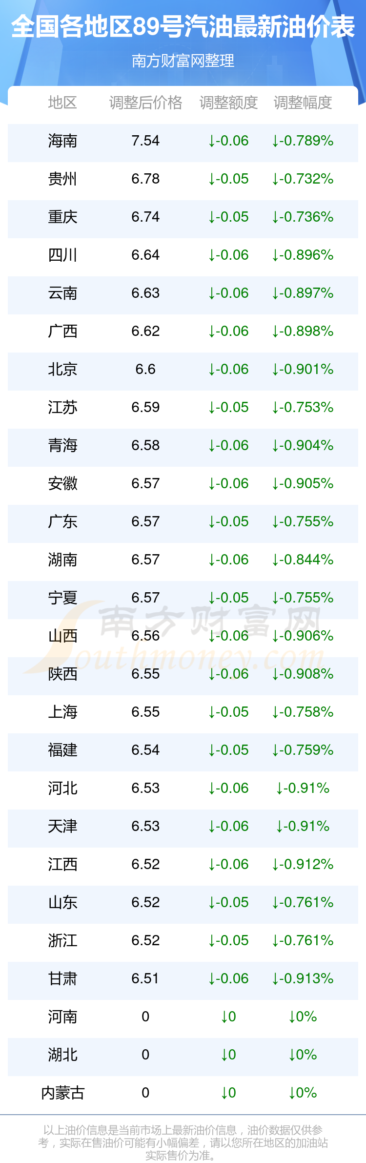 10月23日,全国89号汽油最新平均价格为:7元每升,调整时间为10月14日,其中,全国89号汽油最低为甘肃,价格为6.51元/升,89号汽油最高为海南,价格为7.54元/升。