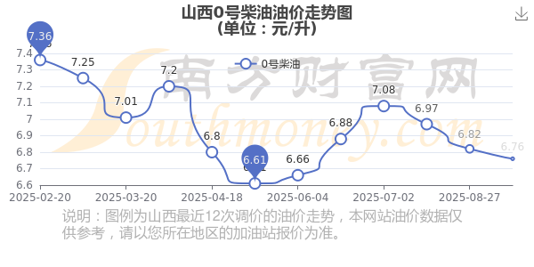山西0号柴油10月23日价格为6.76元/升,调整时间为10月14日,相对上次降了0.06元,降0.88%。