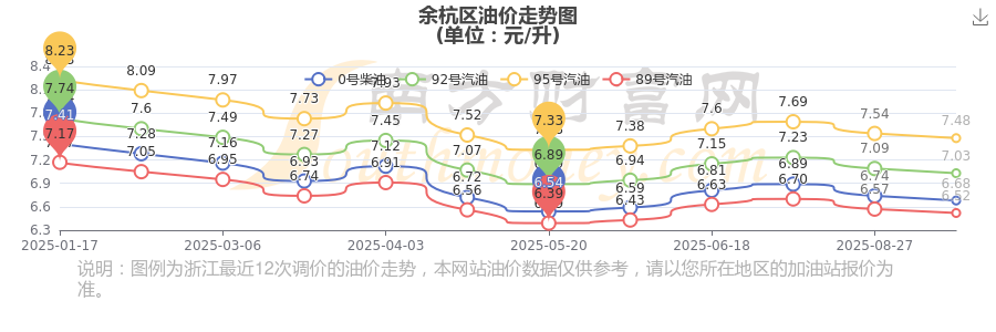10月23日余杭区汽油、柴油每升的价格为:92号汽油为7.03元,下调了0.06元;95号汽油为7.48元,下调了0.06元;89号汽油为6.52元,下调了0.05元;0号柴油为6.68元,下调了0.06元,本轮油价的调整时间为10月14日。