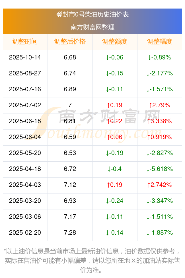 登封市0号柴油历史油价表