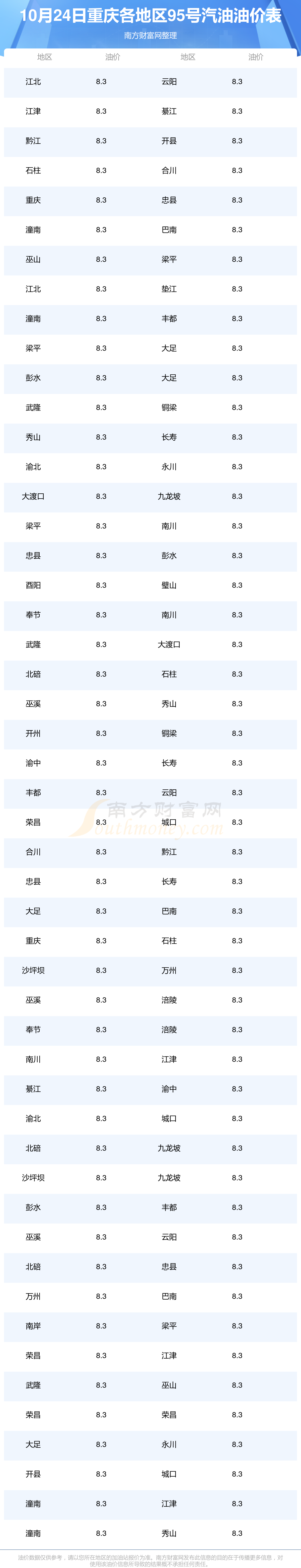 10月24日重庆95号汽油价格是10月14日调整后的价格,具体价格是7.53元每升,相对上轮调整时间8月27日的油价7.59元/升,共下跌了0.06元。