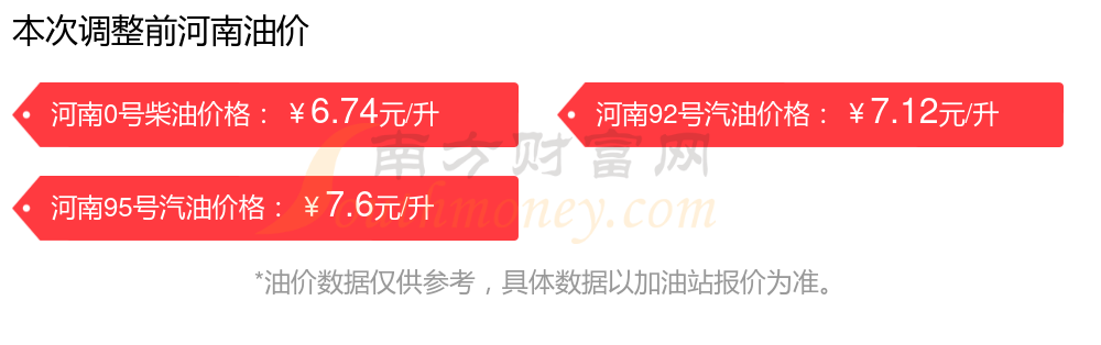 10月24日河南汽油、柴油每升的最新价格:92号汽油7.06元;95号汽油7.54元;0号柴油6.68元,本轮油价的调整时间是10月14日。
