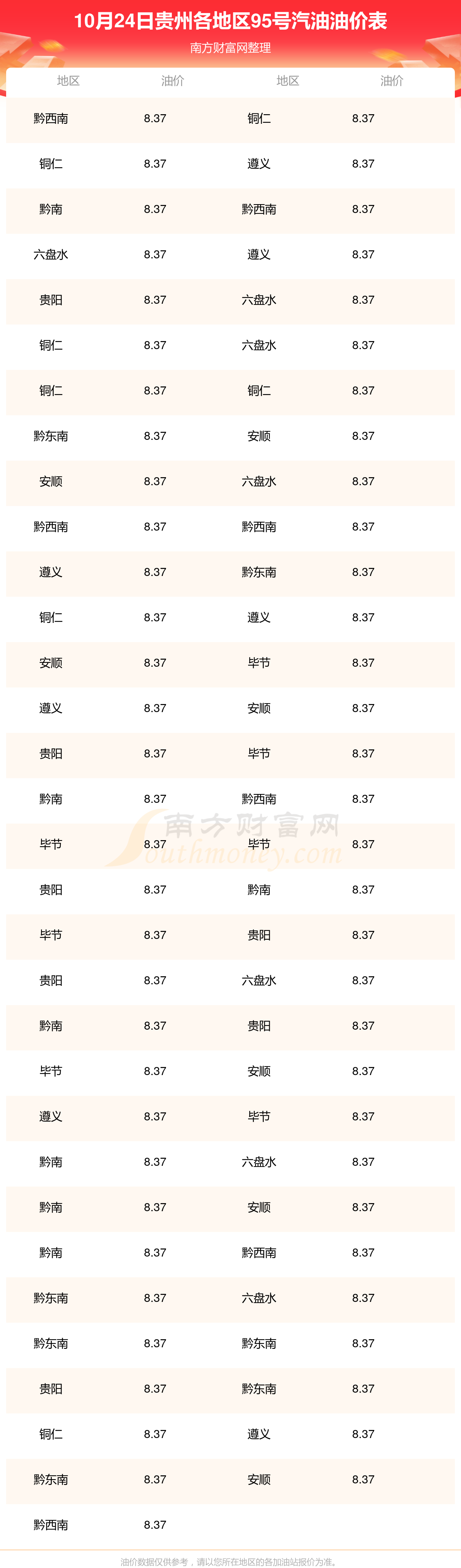 贵州各地区最新95号汽油油价表