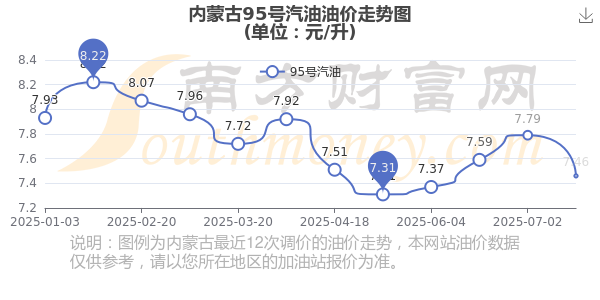 10月24日,内蒙古95号汽油的价格是7.46元每升,本次的调整时间为10月14日,对比上次的调整下降了0.07元,下降0.93%,10月27日24时为下一轮油价调整时间,还有3.91天。