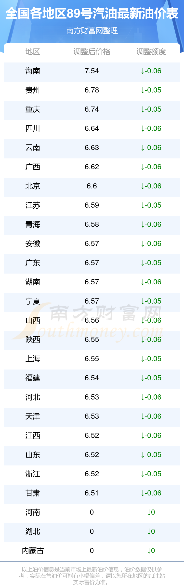 全国各地区最新89号汽油油价表
