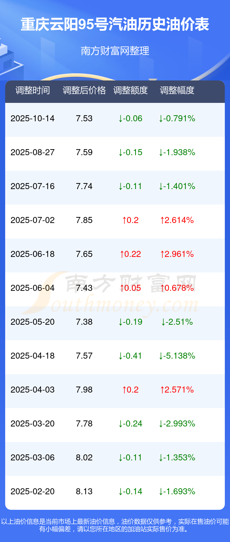 重庆云阳95号汽油历史油价表