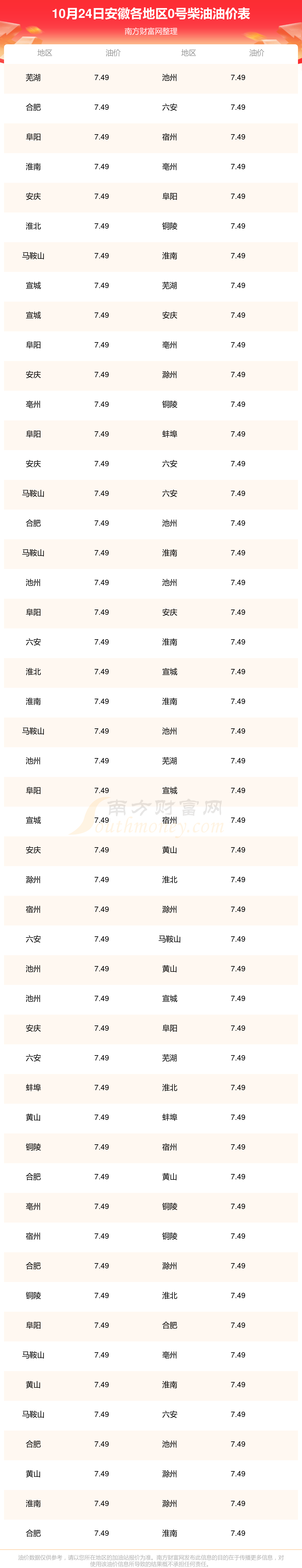 安徽各地区最新0号柴油油价表