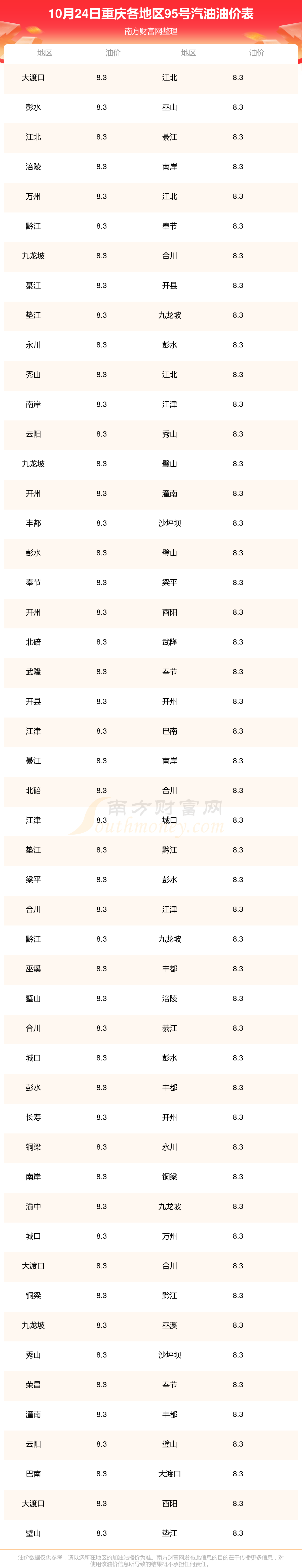 邻水县今日油价:10月24日92号、95号汽油价格多少钱一升?