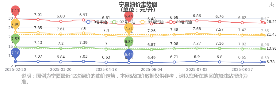 10月24日宁夏汽油、柴油每升的最新价格:92号汽油6.96元,下调了0.06元;95号汽油7.35元,下调了0.07元;89号汽油6.57元,下调了0.05;0号柴油为6.59元,下调了0.06元,本次油价调整时间是10月14日。