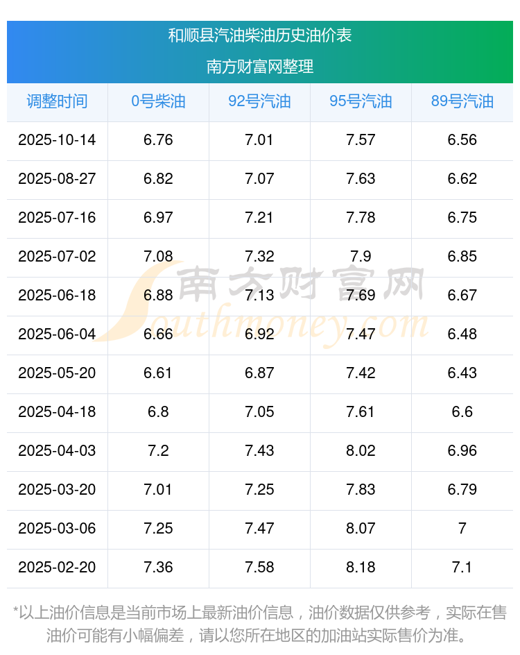 和顺县今日油价:10月24日和顺县汽油柴油价格查询