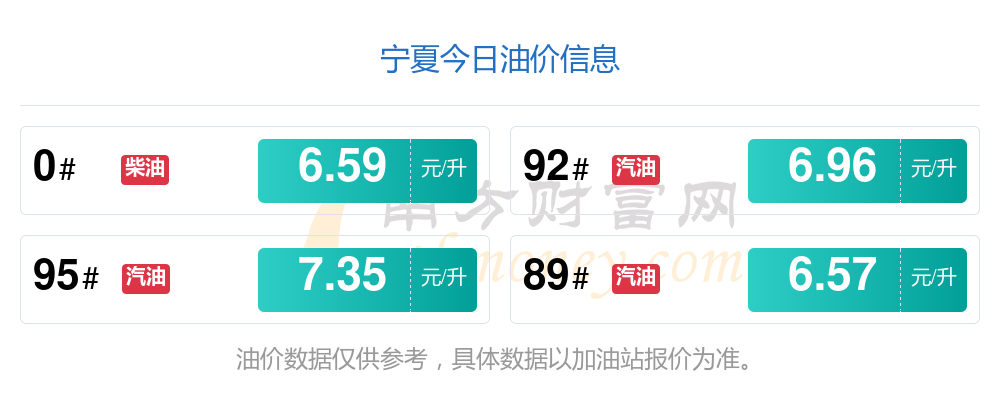 宁夏汽油、柴油10月24日每升最新价格为:调整时间为10月14日,92号汽油为6.96元,降了0.06元;95号汽油为7.35元,降了0.07元;89号汽油为6.57元,降了0.05;0号柴油为6.59元,降了0.06元。