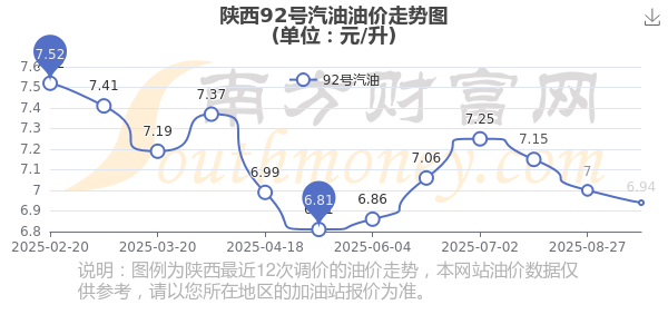 10月24日,陕西汽油、柴油价格的调整时间为10月14日。每升最新价格为:92号汽油为6.94元,跌了0.06元;95号汽油为7.34元,跌了0.06元;89号汽油为6.55元,跌了0.06;0号柴油为6.6元,跌了0.06元。