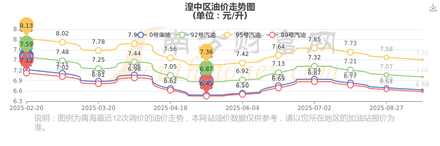 湟中区汽油、柴油10月24日每升的价格为10月14日调整后的价格:92号汽油7.01元;95号汽油7.51元;89号汽油6.58元;0号柴油6.63元。