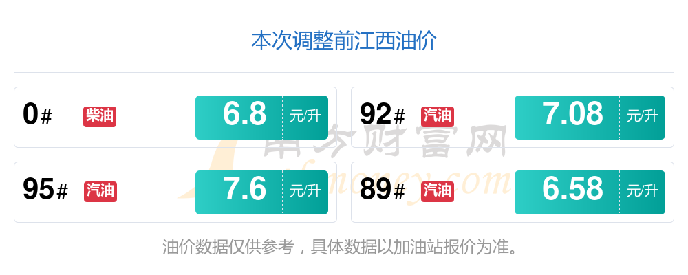 江西汽油、柴油10月24日每升最新价格多少钱一升?本次油价调整时间为10月14日,92号汽油为7.02元,降了0.06元;95号汽油为7.53元,降了0.07元;89号汽油为6.52元,降了0.06;0号柴油为6.74元,降了0.06元。