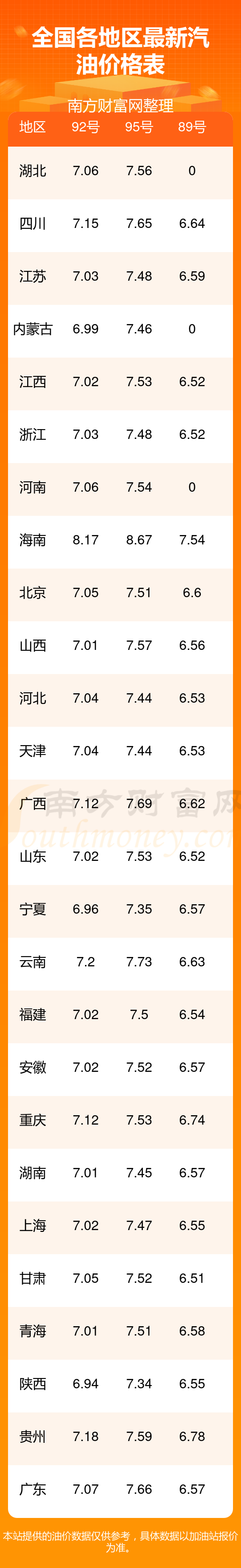 全国各地区最新油价表