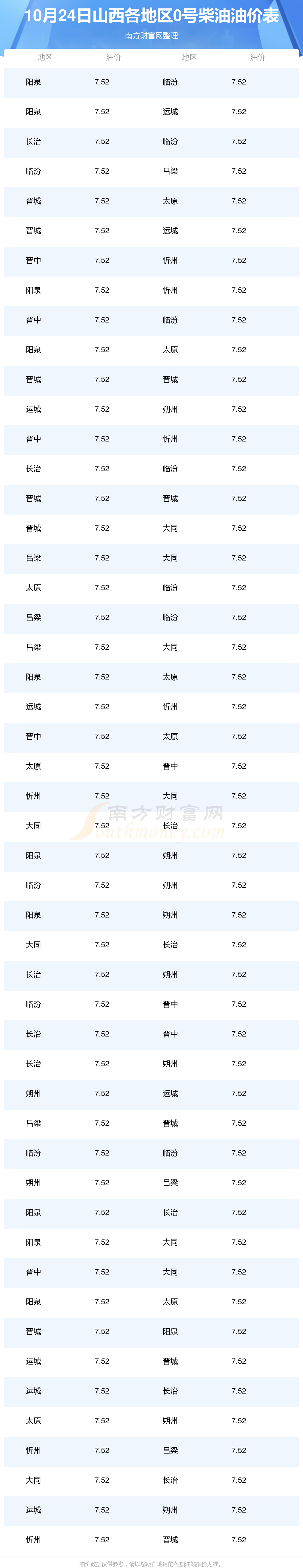 山西各地区最新0号柴油油价表