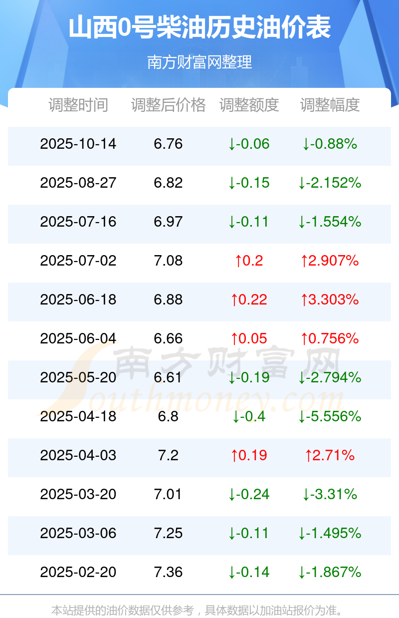 10月24日山西0号柴油价格是6.76元每升,这是10月14日调整后的价格,相对上一轮调整时间8月27日的油价6.82元/升,减了0.06元。