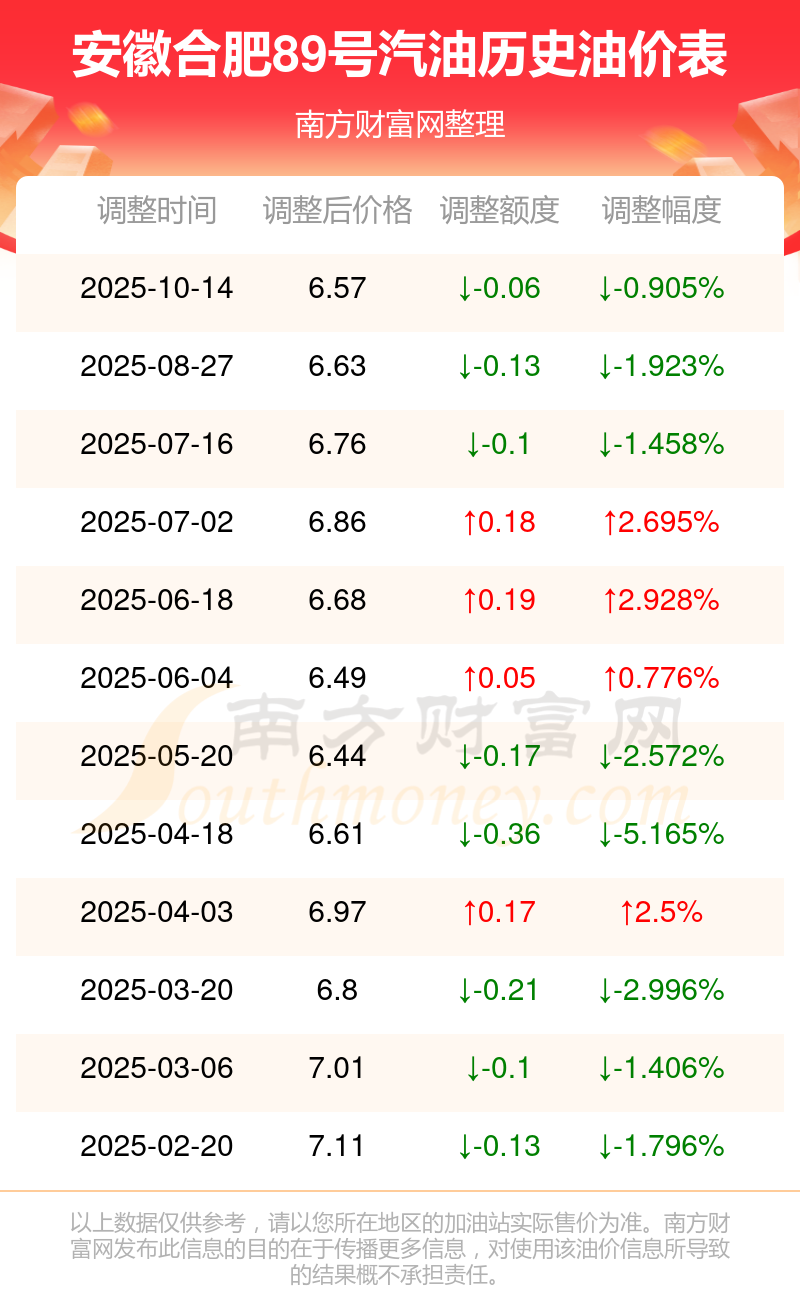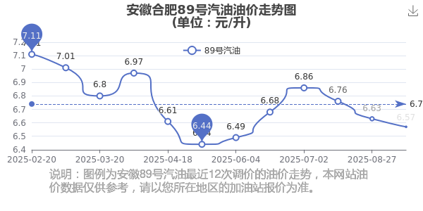 10月24日安徽合肥89号汽油的价格是6.57元/升(调整时间为10月14日),对比上次调整时间8月27日的油价6.63元/升,跌了0.06元,跌幅达0.905%。