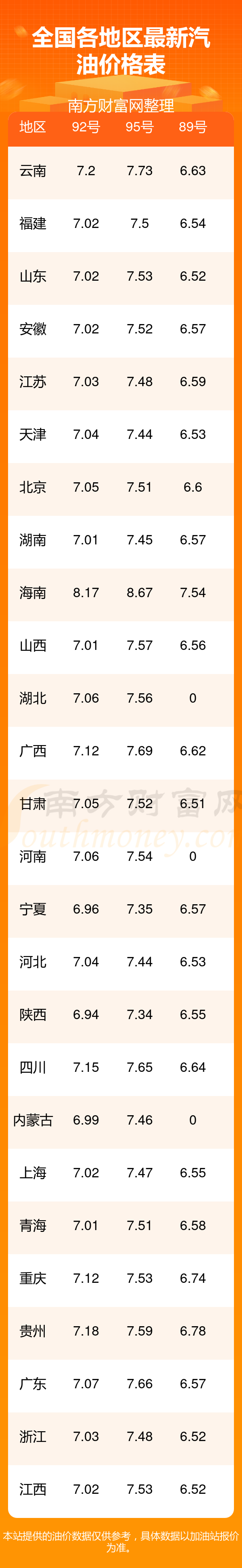 全国各地区最新油价表