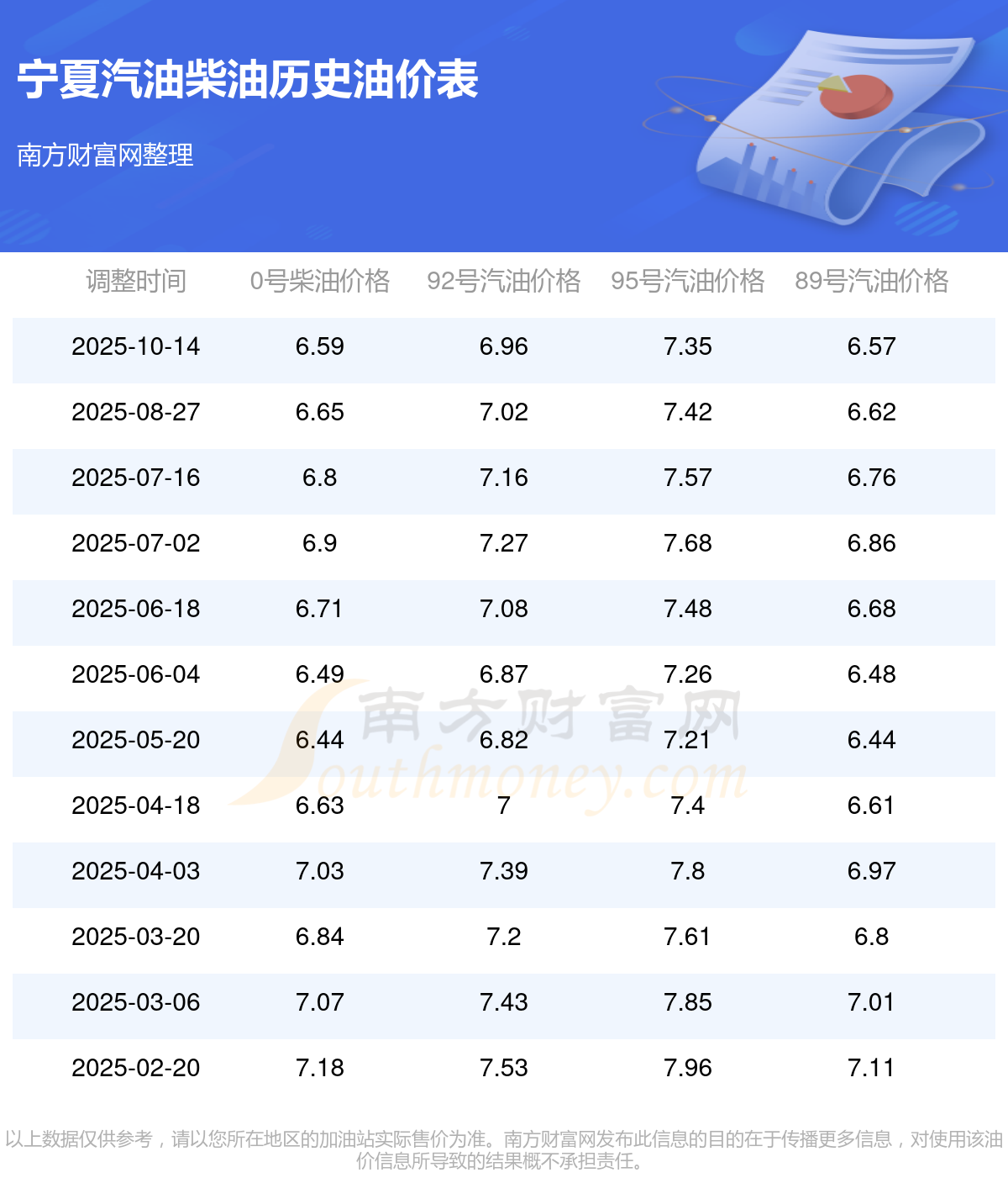 10月24日宁夏汽油、柴油的最新价格是10月14日调整后的价格,具体为92号汽油6.96元,下调了0.06元,下调幅达0.86%;95号汽油7.35元,下调了0.07元,下调幅达0.94%;89号汽油6.57元,下调了0.05元,下调幅达0.76%;0号柴油6.59元,下调了0.06元,下调幅达0.9%。