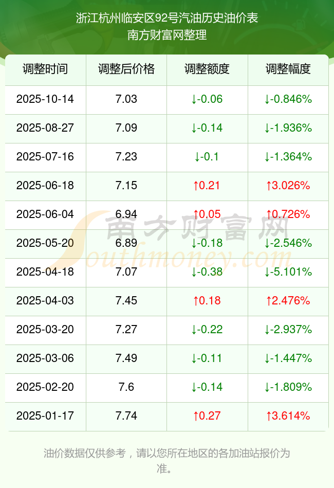 10月24日浙江杭州临安区92号汽油价格表_今日92号汽油油价查询