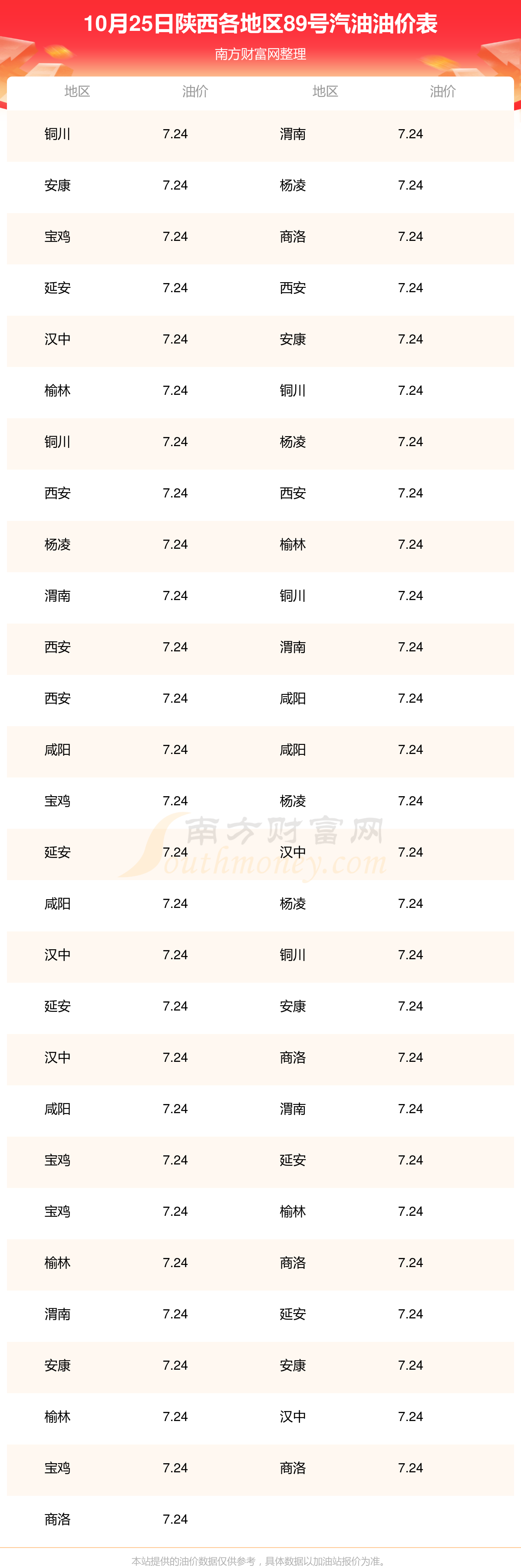 10月25日陕西89号汽油价格是10月14日调整后的价格,具体价格是6.55元每升,相对上轮调整时间8月27日的油价6.61元/升,共降了0.06元。