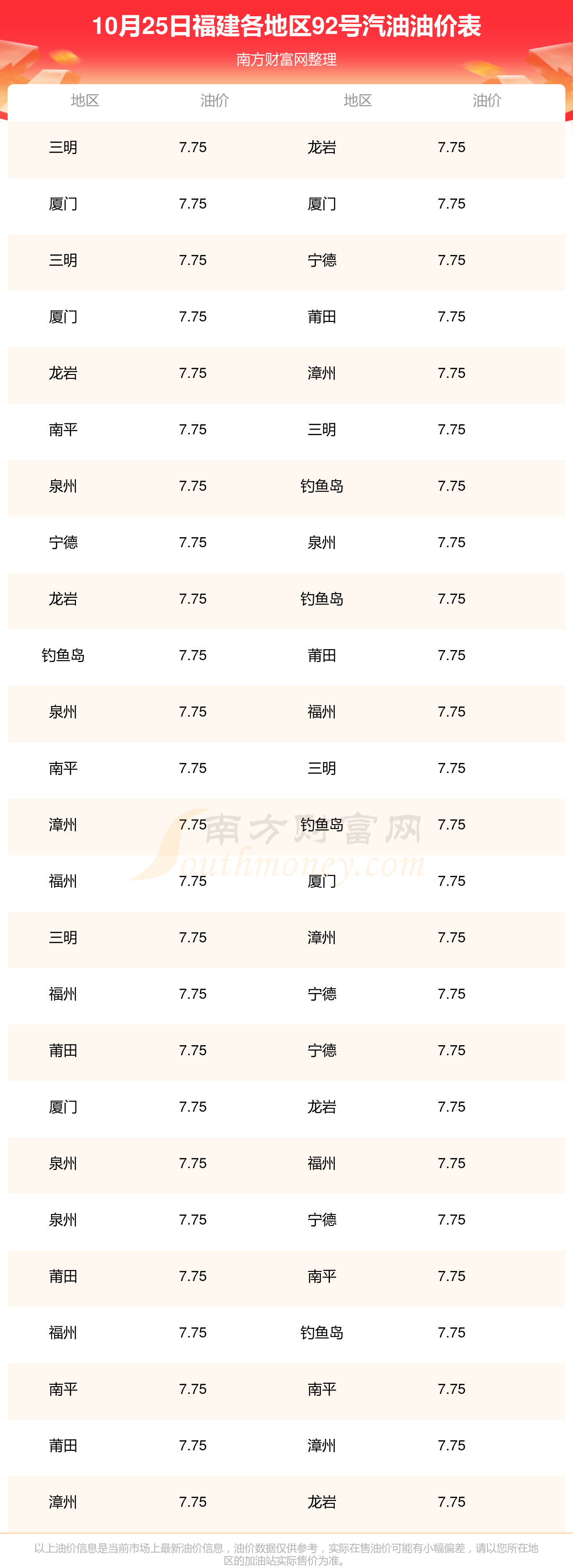 10月25日,福建92号汽油最新价格为:7.02元每升,调整时间为10月14日,相对上次调整时间8月27日的油价7.08元每升,跌了0.06元,跌幅达0.847%。