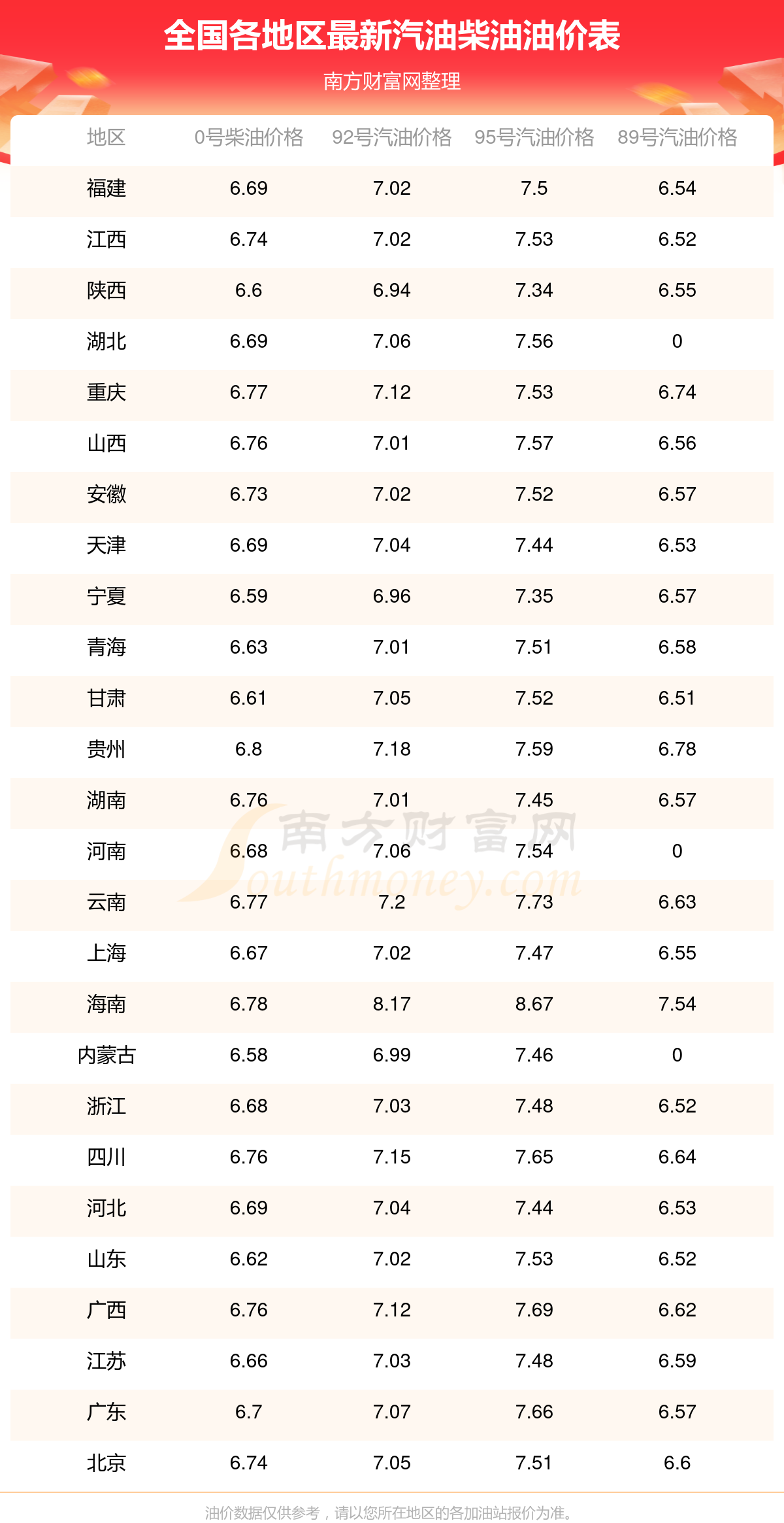 以上油价信息是当前市场上最新油价信息,油价数据仅供参考,实际在售油价可能有小幅偏差,请以您所在地区的加油站实际售价为准。
