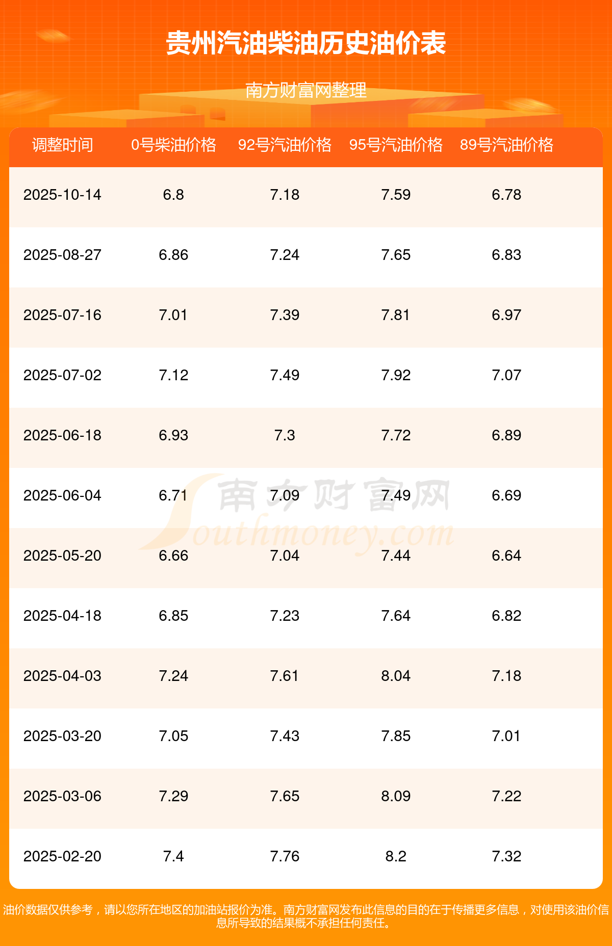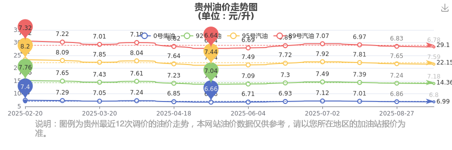 10月25日,贵州汽油、柴油价格的调整时间为10月14日。每升最新价格为:92号汽油为7.18元,下调了0.06元;95号汽油为7.59元,下调了0.06元;89号汽油为6.78元,下调了0.05;0号柴油为6.8元,下调了0.06元。