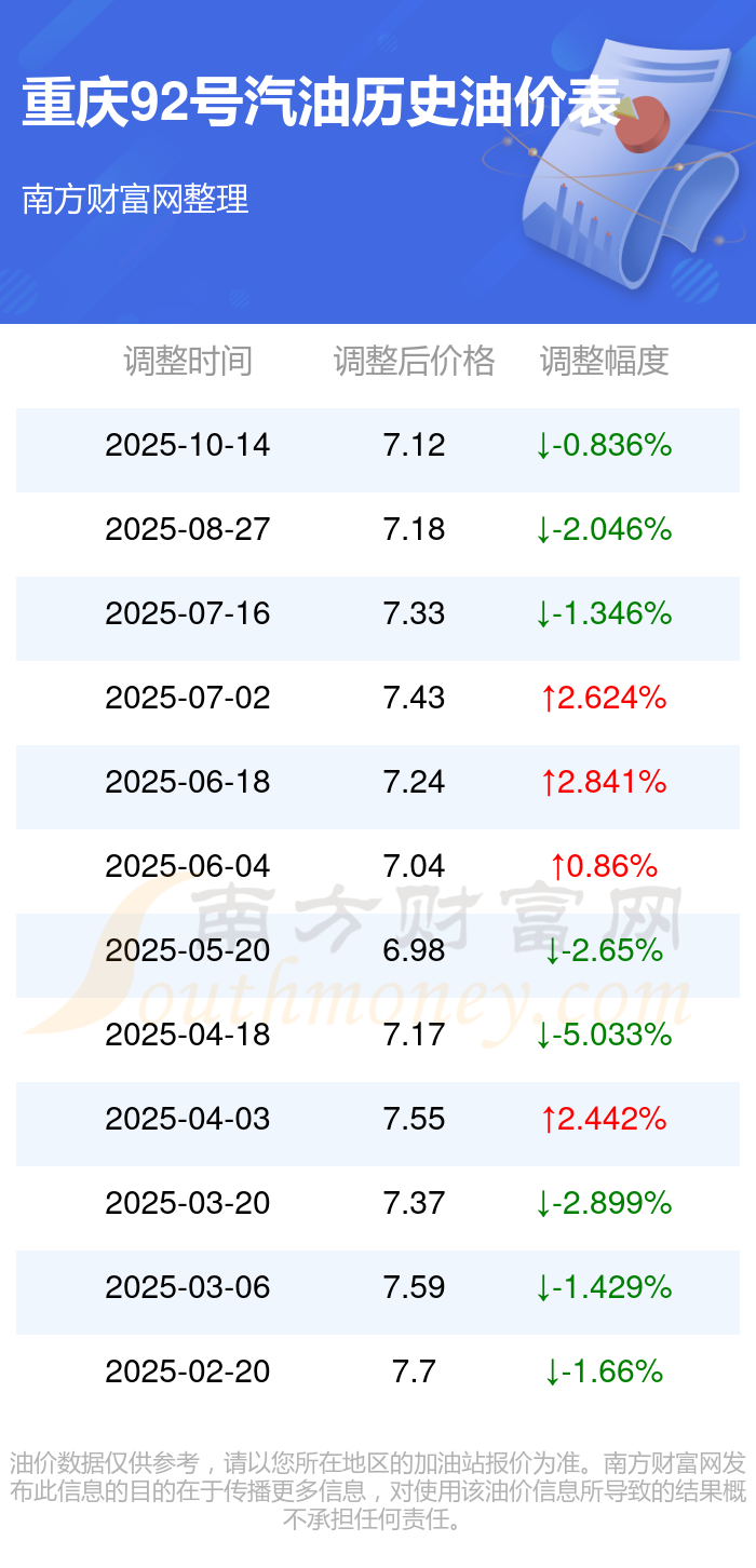 10月25日重庆92号汽油价格为7.12元每升,本次调整时间为10月14日,相对上次调整后8月27日的油价7.18元每升,下降了0.06元,下降幅达0.836%。