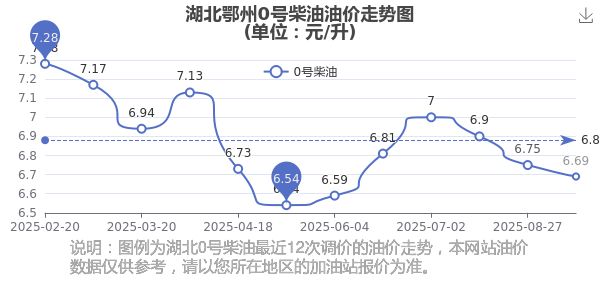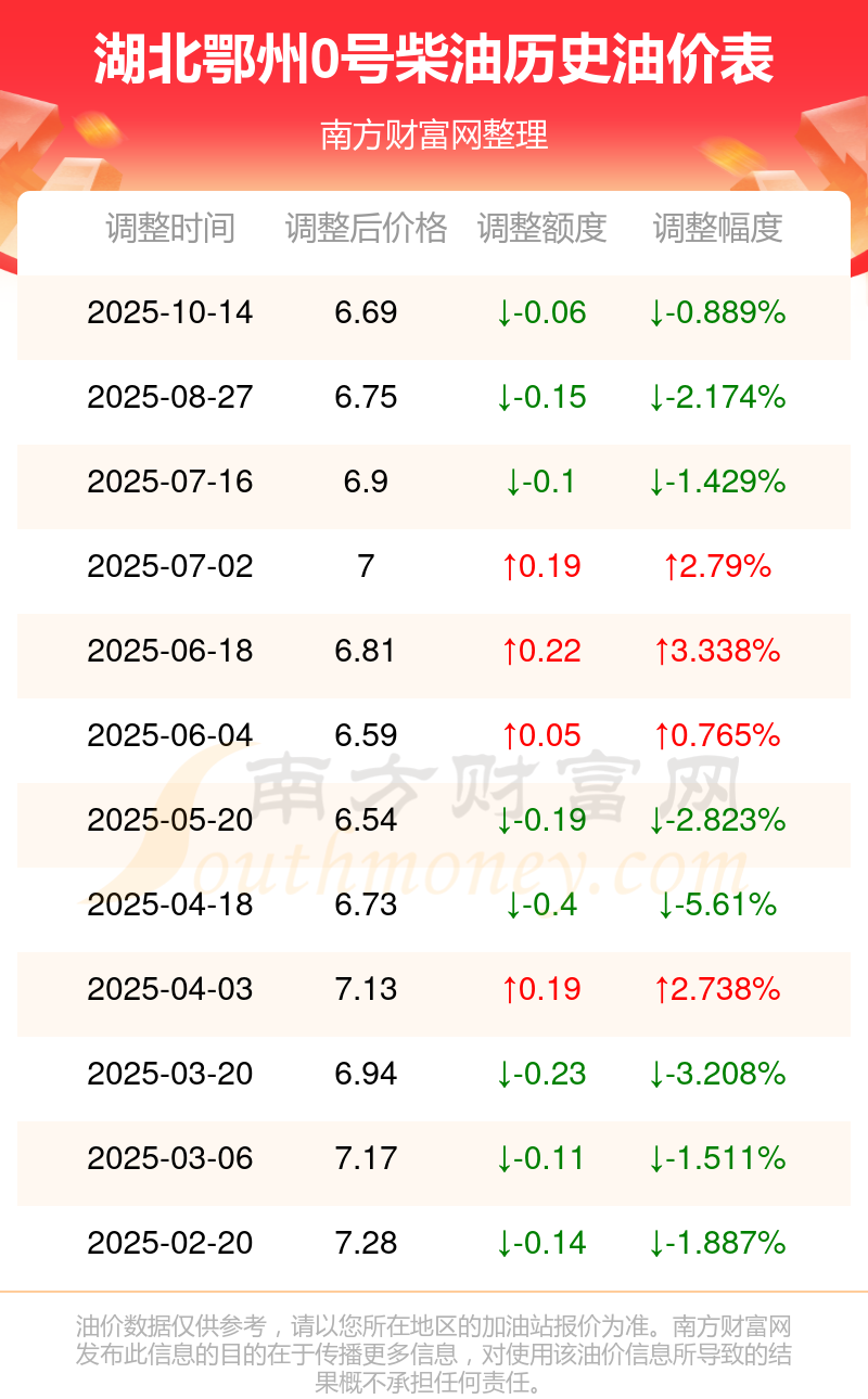 10月25日,湖北鄂州0号柴油的价格为6.69元/升,这是10月14日油价调整后的价格,对比上一轮油价调整时间8月27日的价格6.75元每升,减了0.06元,减幅达0.889%。