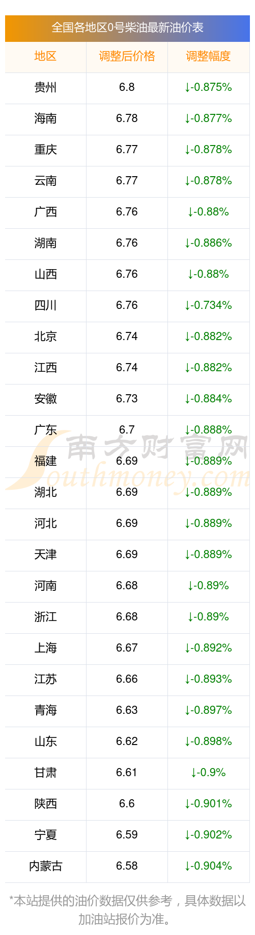 全国各地区最新0号柴油油价表