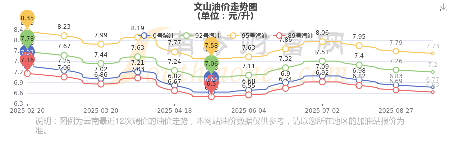 10月25日文山汽油、柴油每升价格:距离最近的油价调整时间是10月14日,92号汽油为7.2元,减了0.06元,减幅达0.83%;95号汽油为7.73元,减了0.06元,减幅达0.77%;89号汽油为6.63元,减了0.06元,减幅达0.9%;0号柴油为6.77元,减了0.06元,减幅达0.88%。