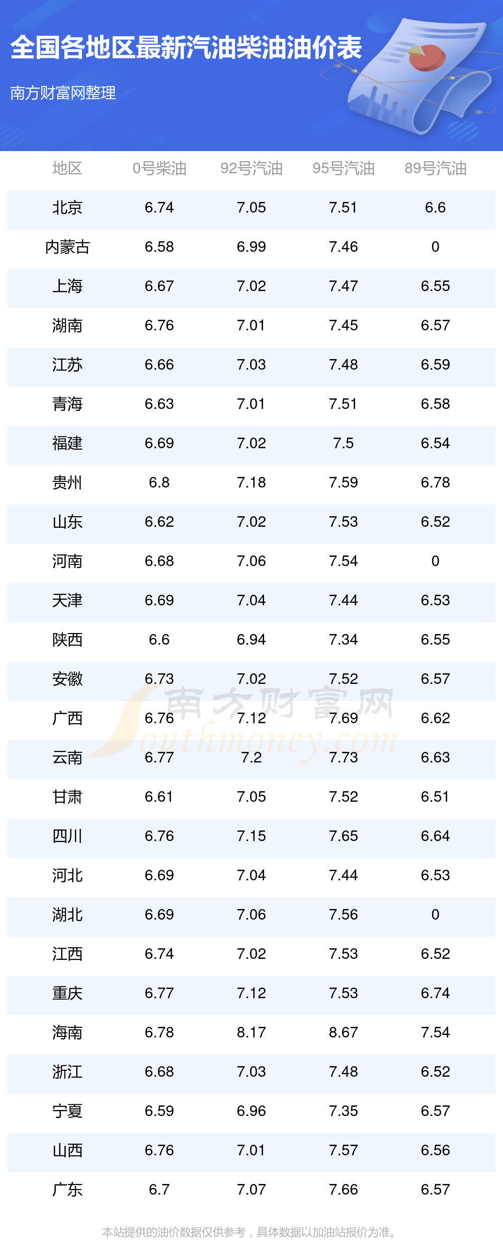 全国各地区最新汽油价格表