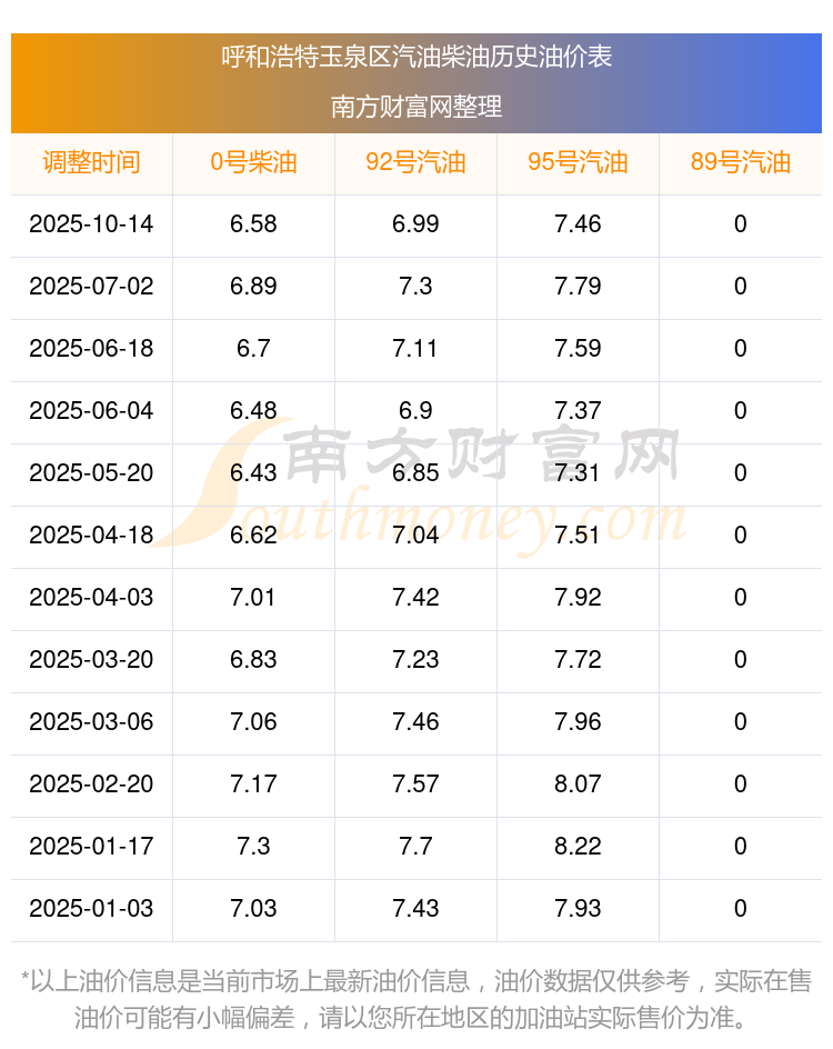 呼和浩特玉泉区油价今日价格,汽油柴油价格一览表(10月25日)