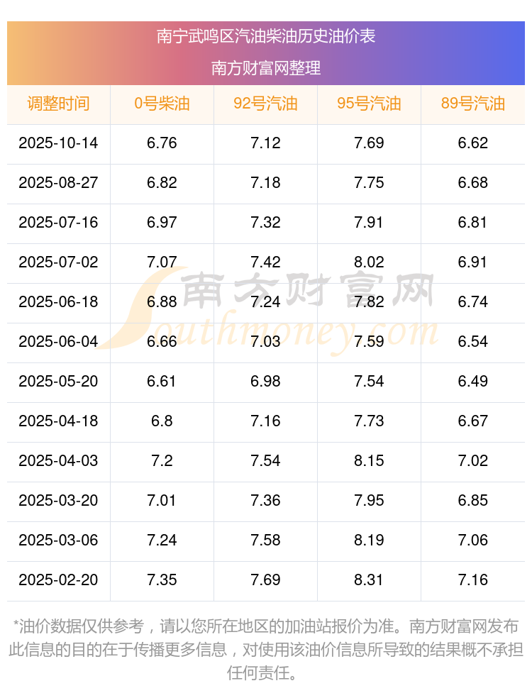 今日南宁武鸣区汽油价格一览表(10月25日)