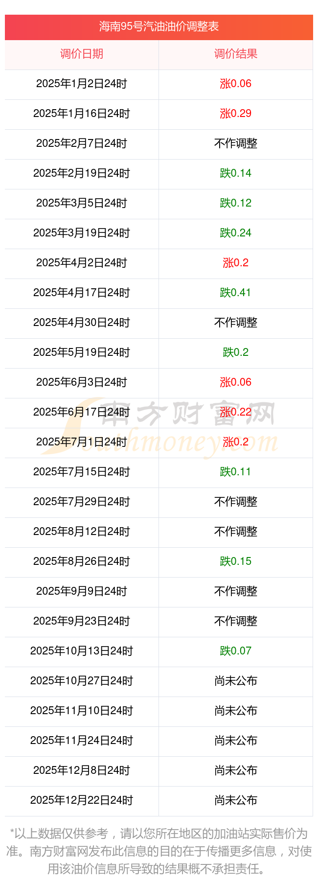 10月25日,海南95号汽油的价格是8.67元每升,本次的调整时间为10月14日,对比上次的调整跌了0.07元,跌0.801%,下次调整时间为10月27日24时,还有2.9天。