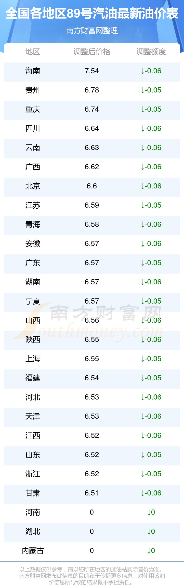 国内今日油价89号汽油-10月25日全国汽油价格89号汽油一览表