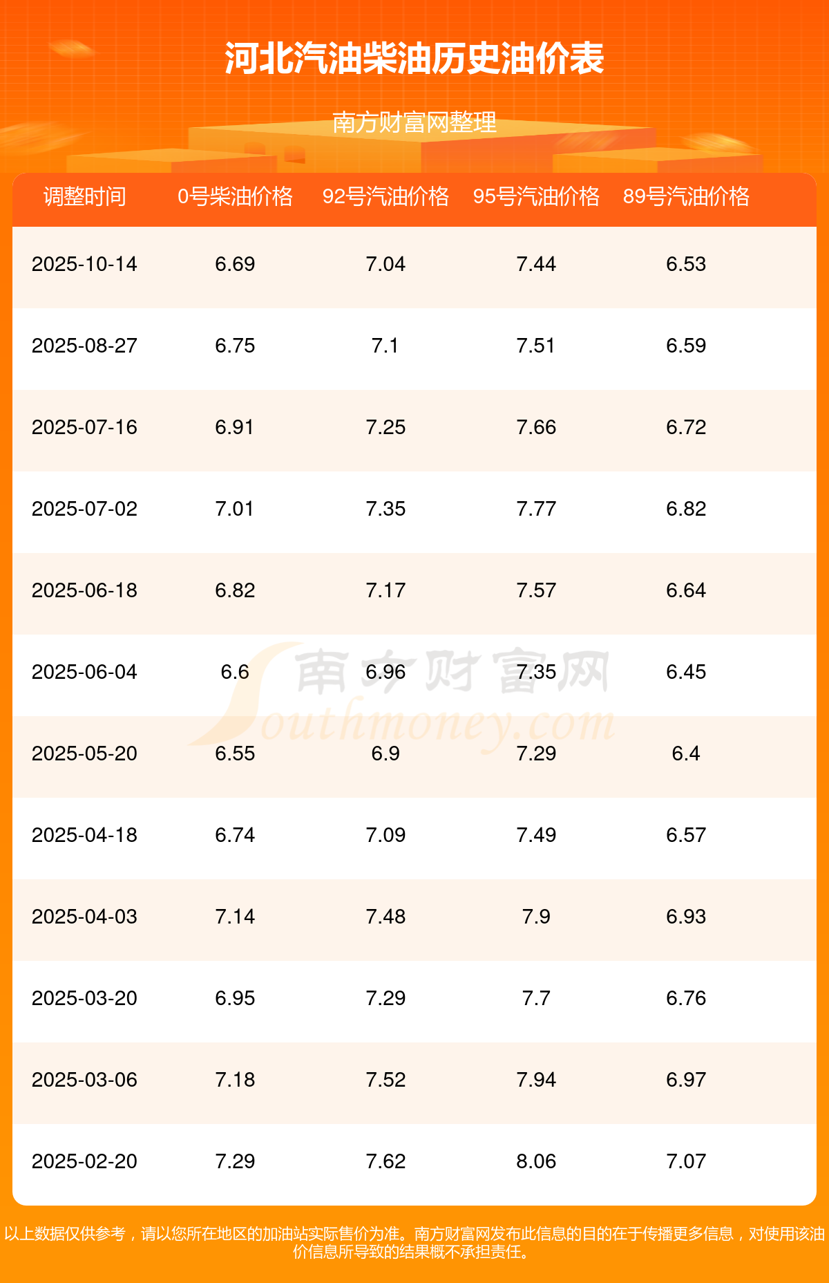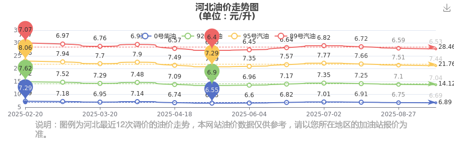 10月25日河北汽油、柴油每升最新价格多少钱一升?具体为:92号汽油7.04元,跌了0.06元;95号汽油7.44元,跌了0.07元;89号汽油6.53元,跌了0.06;0号柴油为6.69元,跌了0.06元,本次的调整时间是10月14日。