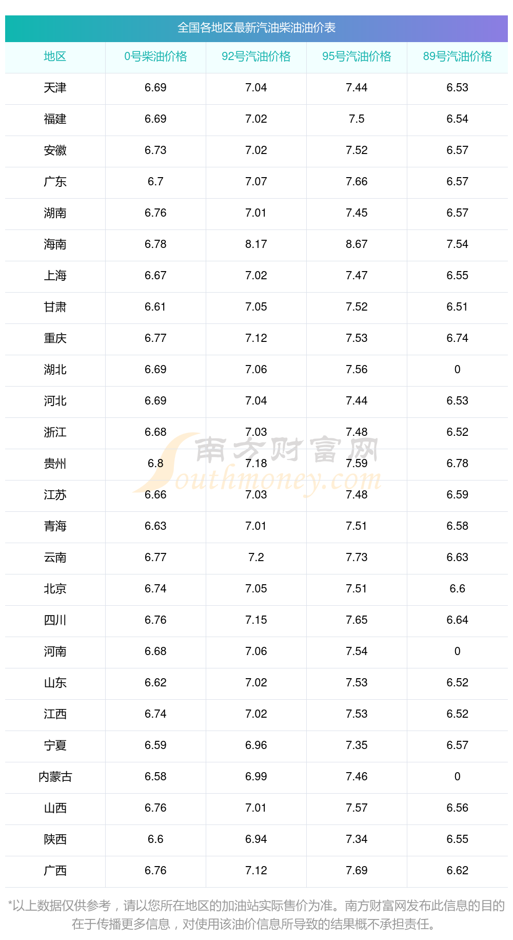 油价数据仅供参考,请以您所在地区的加油站报价为准。油价发布此信息的目的在于传播更多信息,对使用该油价信息所导致的结果概不承担任何责任。