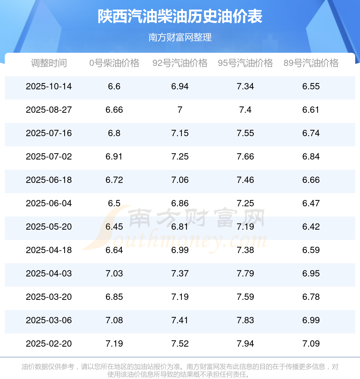 10月25日,陕西92号汽油的价格是6.94元每升,本次的调整时间为10月14日,对比上次的调整下跌了0.06元,下跌0.857%,10月27日24时为下一轮油价调整时间,还有2.9天。