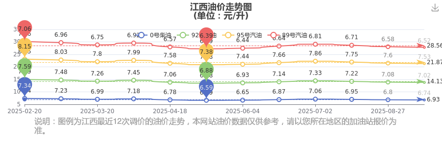10月25日,江西汽油、柴油每升最新价格为:调整时间为10月14日,92号汽油为7.02元,下跌了0.06元,下跌幅达0.85%;95号汽油为7.53元,下跌了0.07元,下跌幅达0.92%;89号汽油为6.52元,下跌了0.06元,下跌幅达0.91%;0号柴油为6.74元,下跌了0.06元,下跌幅达0.88%。