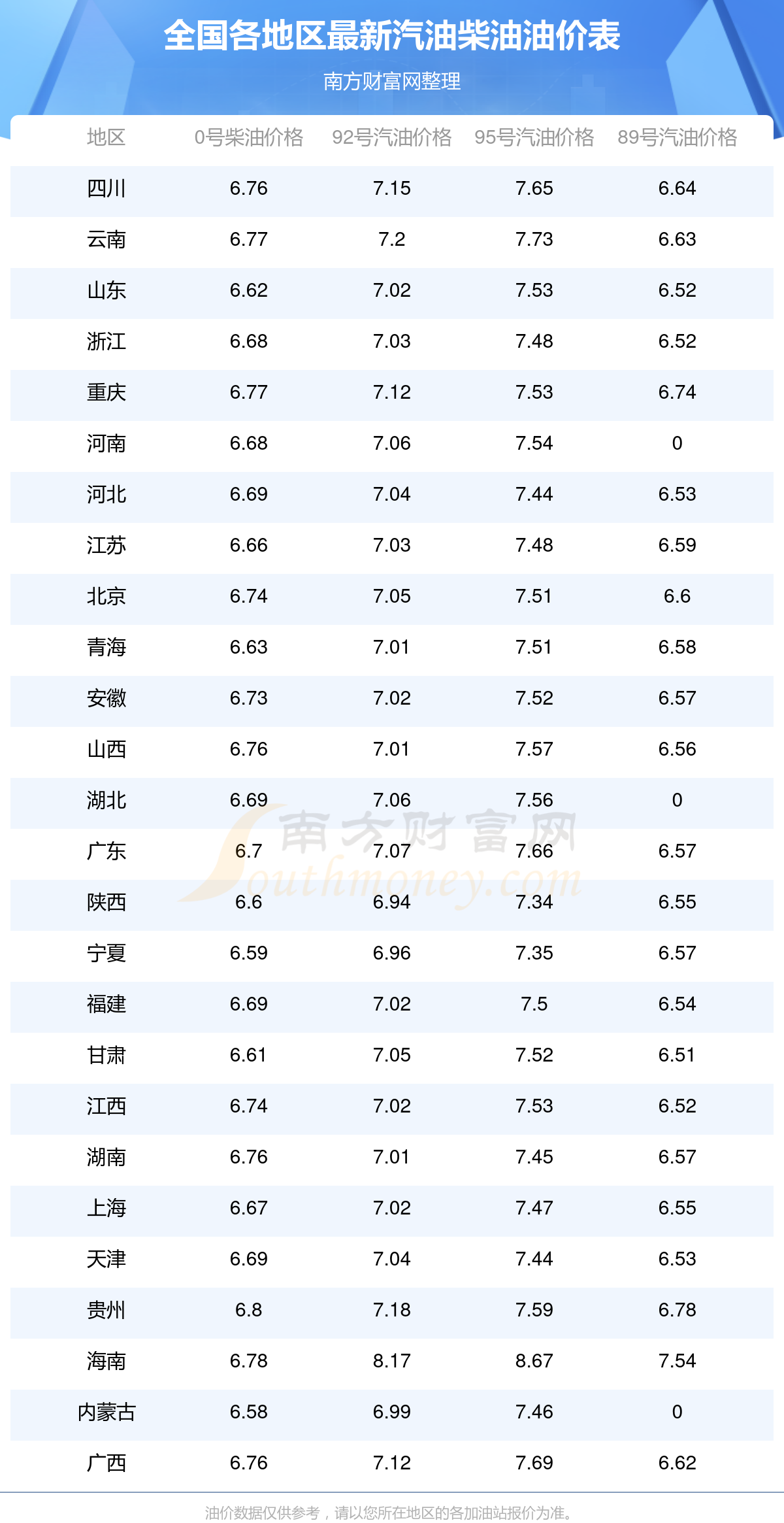 全国各地区最新油价表