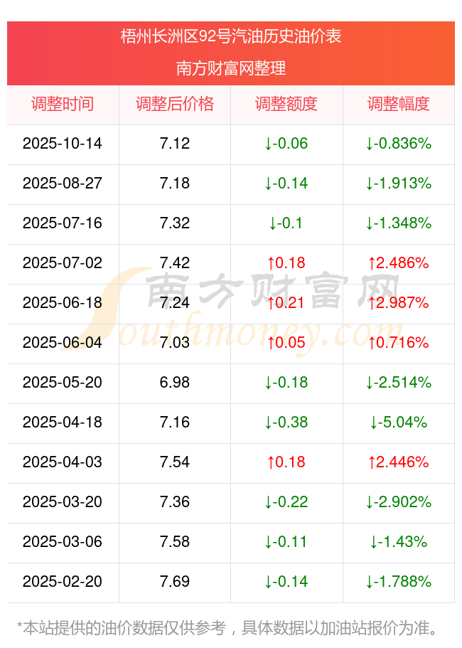 梧州长洲区92号汽油10月25日的价格为10月14日调整后的价格,具体为7.12元/升,相对上次调整降了0.06元。