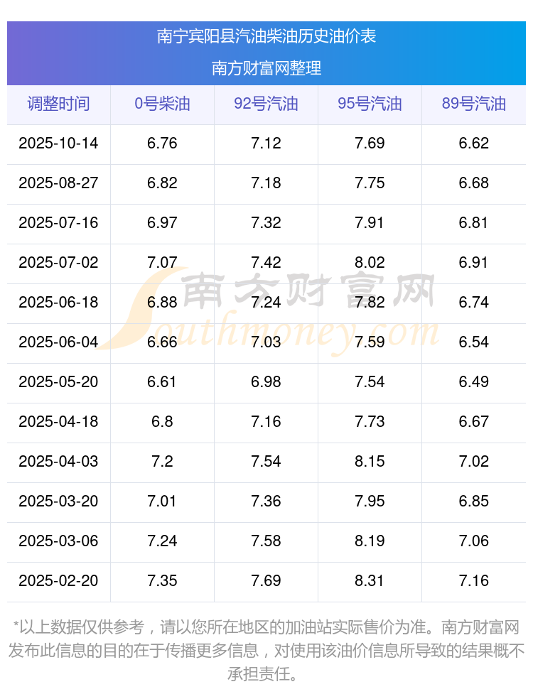 南宁宾阳县油价今日价格,汽油柴油价格一览表(10月25日)