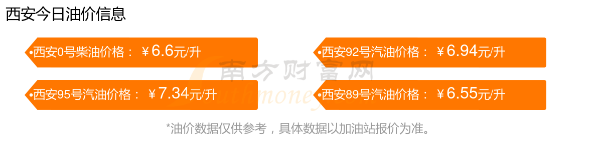 西安汽油、柴油10月26日的价格是多少钱一升?详情为:92号汽油为6.94元,下降了0.06元;95号汽油为7.34元,下降了0.06元;89号汽油为6.55元,下降了0.06元;0号柴油为6.6元,下降了0.06元,本次油价的调整时间为10月14日。
