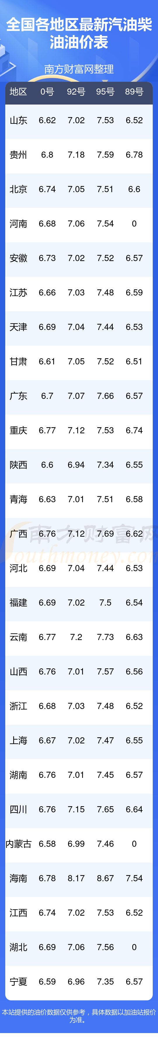全国各地区最新油价表