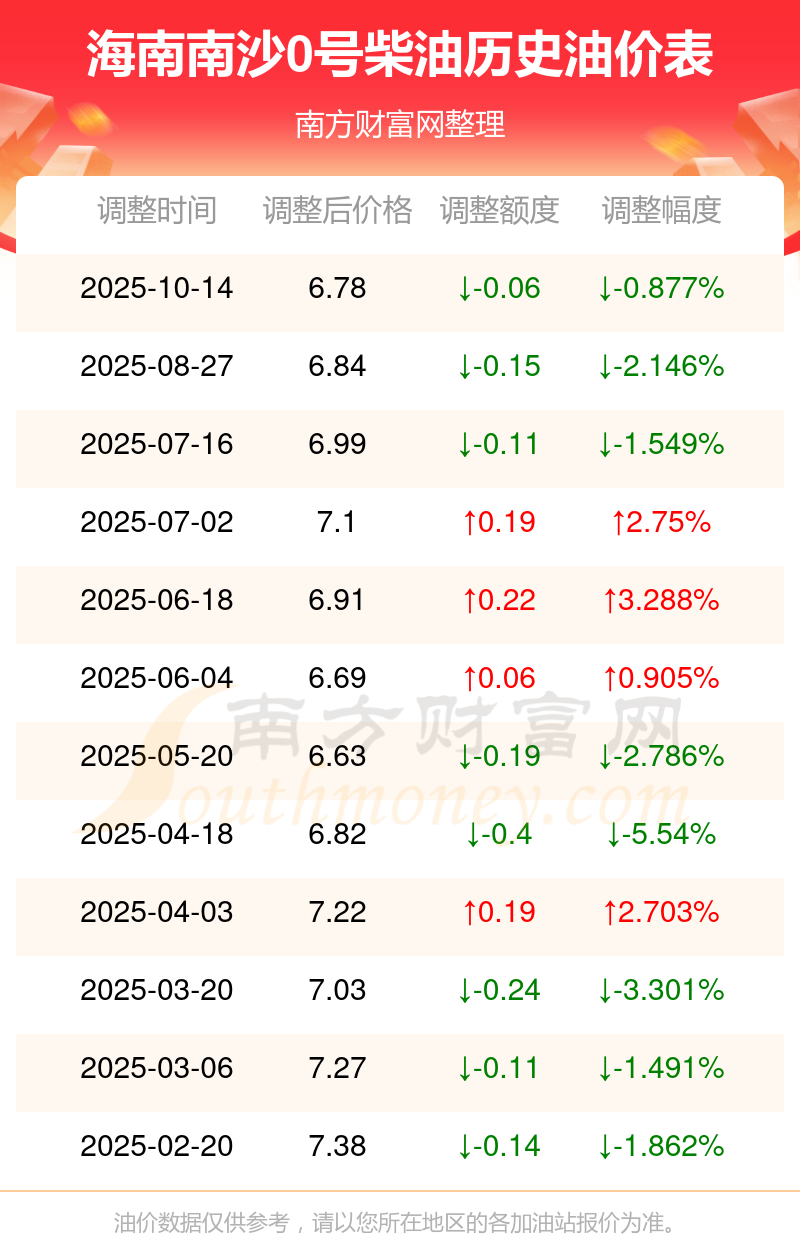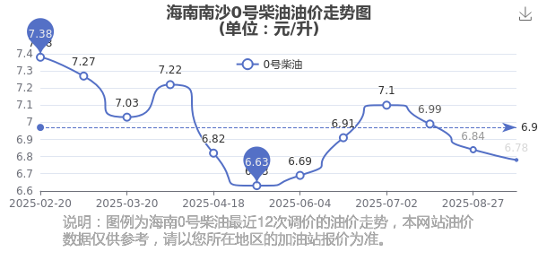 10月26日,海南南沙0号柴油最新价格为:6.78元每升,调整时间为10月14日,相对上次调整时间8月27日的油价6.84元每升,下降了0.06元,下降幅达0.877%。