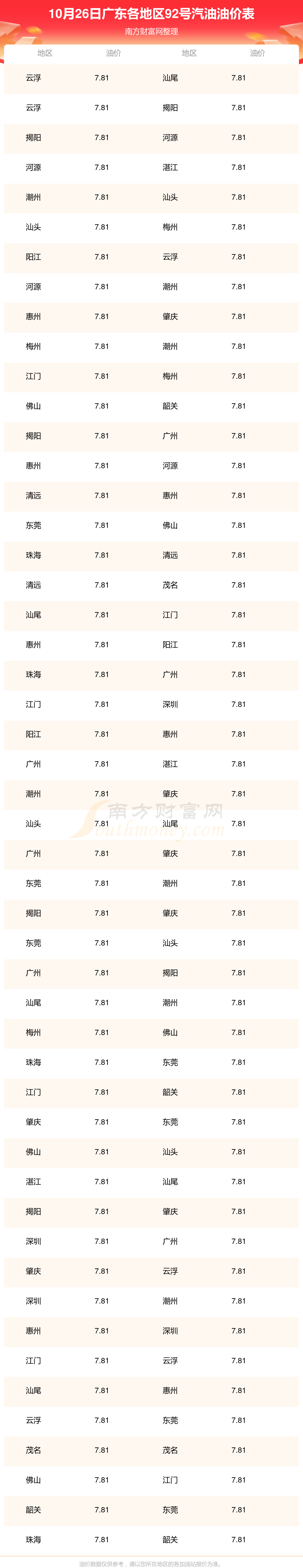 上海今日油价查询_10月26日上海汽油价格一览表 油价网2025-10-26 05:11 今日油价查询_10月26日全国0号柴油价格查询 油价网2025-10-26 05:11 今日油价查询_10月26日全国各地区92号、95号汽油价格表一览 油价网2025-10-26 04:57