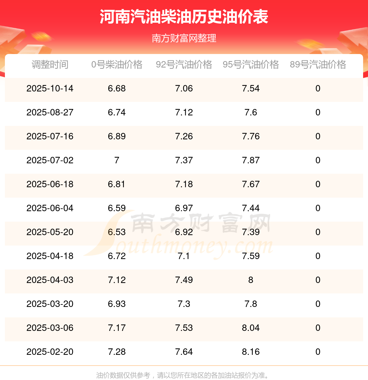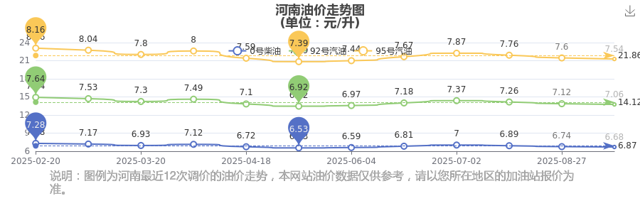 10月26日河南汽油、柴油的最新价格是10月14日调整后的价格,具体为92号汽油7.06元,下跌了0.06元,下跌幅达0.84%;95号汽油7.54元,下跌了0.06元,下跌幅达0.79%;0号柴油6.68元,下跌了0.06元,下跌幅达0.89%。